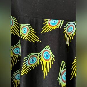 Elegant black skirt featuring a vibrant peacock feather print. Perfect for adding a touch of color to your wardrobe.