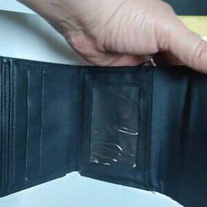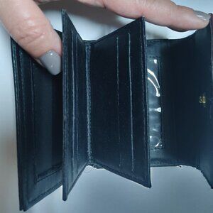 This Design Collection card wallet for women is made of solid black leather with microfiber fabric lining and features a snap closure and a strap accent with a metal logo.