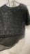 Chic black lace blouse. Short sleeves with sheer detail. Perfect for elegant occasions.