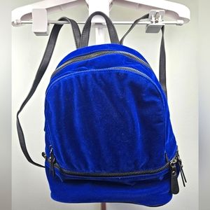 Design Lab Blue velvet /velour look and feel backpack. Polyester with a velvet look/feel. Black hematite looking zipper with black polyurethane handles and piping. 2 front pockets and one fake front pocket. Inside zippered pocket. Small purse size backpack. Overall great preowned condition.