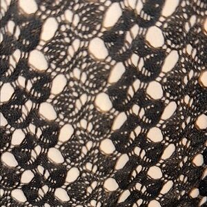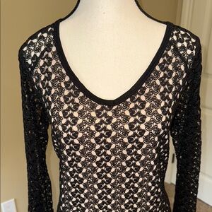 This stylish black blouse from Design Lab Lord & Taylor features a delicate lace pattern and a flattering V-neckline over a gold inner lining. The semi-sheer lace fabric and long sleeves create a sophisticated look. The lace in the back has a criss cross opening that exposes more of the golden lining. No stretch.