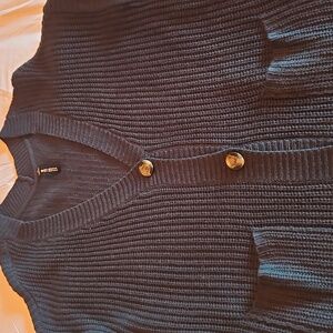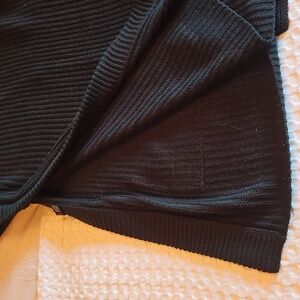 Chic black cardigan with ribbed texture. Features front pockets and button closure. Ideal for layering. worn once