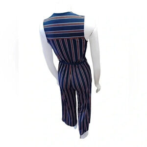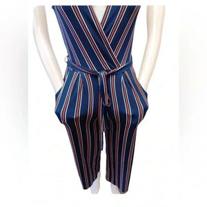 Navy blue with copper and white stripes this wide straight leg jumper is sleeveless and has a deep V neck. Belt loops with matching sash included. An elasticized waist and darts to flatter any figure, plus lots of stretch. Two flat pockets make this romper a must have.