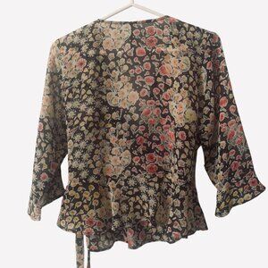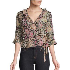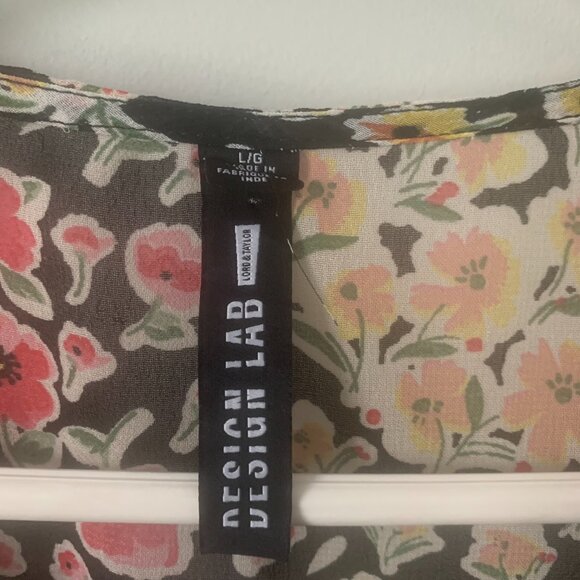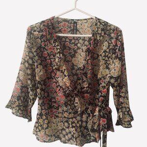 Design Lab 3/4 sleeves top with delicate ruffles around sleeves and v-neck line. Elegant blouse that can be dressed up or down. Front wrap with self tie. Peplum ruffled hem. Size large, new condition, no stain/rips/tears.