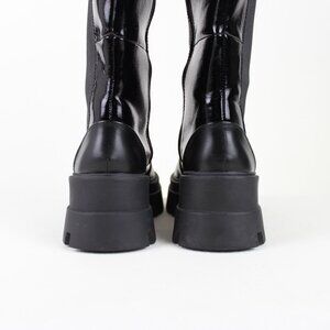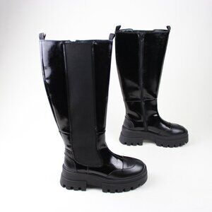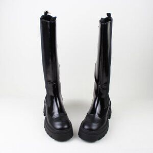 Tall boots in a classic black shade. Made from planet-friendly recycled materials that provide excellent durability. The upper part is made from polyurethane (PU) to boost water resistance. The platform soles are made from thermoplastic rubber (TPR), making them lighter than regular rubber soles while still providing excellent grip, cushioning, and flexibility for a comfortable fit. Perfect for spring, fall and winter. New with tags. Excellent condition.