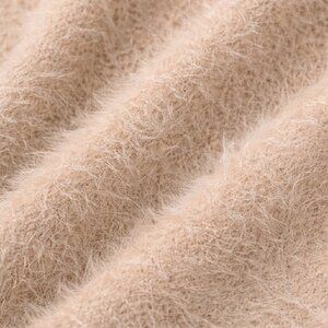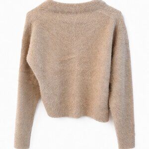 Women’s fuzzy V-neck sweater in a soft beige tone made from a nylon acrylic blend. Lightweight cozy knit with long sleeves, perfect for fall layering, casual wear, and everyday outfits.