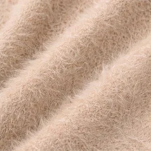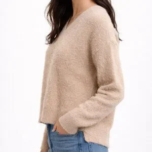Women’s fuzzy V-neck sweater in a soft beige tone made from a nylon acrylic blend. Lightweight cozy knit with long sleeves, perfect for fall layering, casual wear, and everyday outfits.