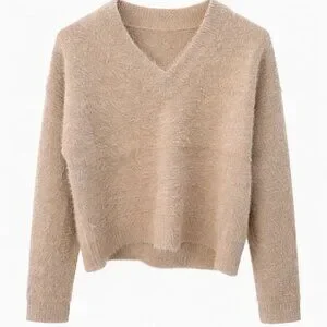Soft fuzzy V-neck sweater for women in a neutral beige tone, featuring a cozy lightweight knit that’s perfect for fall and winter layering. Designed with long sleeves and a comfortable fit, this versatile sweater pairs effortlessly with denim or casual outfits.