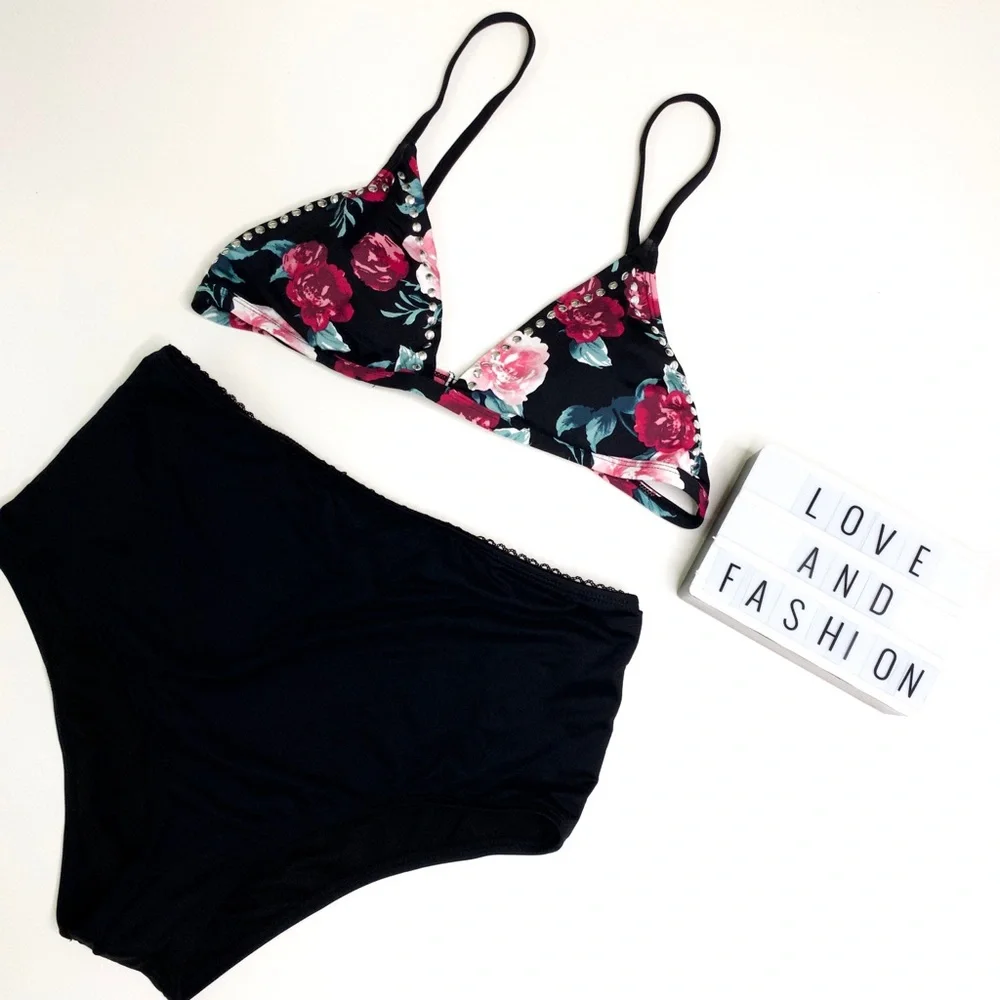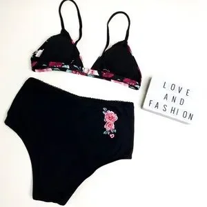Two piece swimsuit. Bralette top with high waisted bottom with roses embroidery.