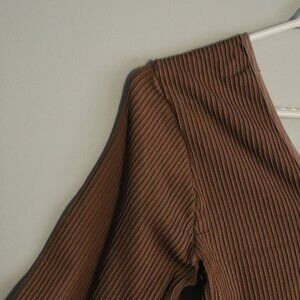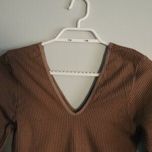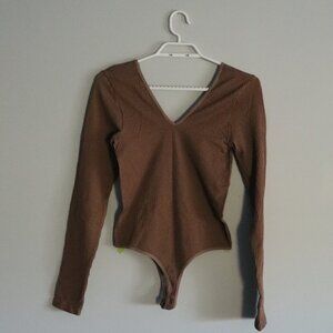 Design Lab Women's Brown M/L Ribbed V-Neck Long Sleeve Thong One Piece Bodysuit