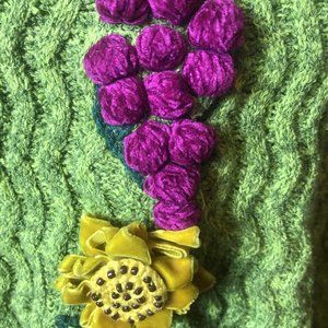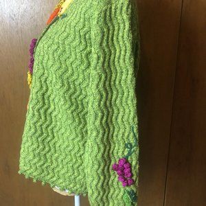 Make your next garden party FUN with this sweater by Philip and Jane Gordon. Vintage "fruit" sweater in excellent pre-owned condition. Velvet beaded embellishments make this an eye catching fun sweater. Size small - Sleeve length from underarm 18" Sleeve length from shoulder 24" Sweater 36" around and 24" long.