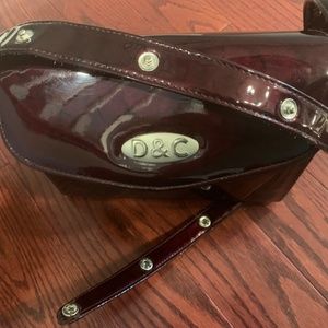 Deep maroon in colour. Strap is adjustable and fastens with domes. Inside has two zippered sections.