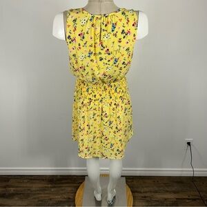 Vibrant yellow dress with floral print. Features sleeveless style and gathered details. In good used condition