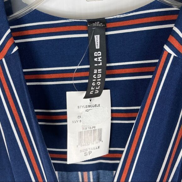 New With Tags Design Lab Lord & Taylor striped jumpsuit in dark blue, burnt orange and white stripes. It has a v-neckline, side pockets and a matching belt. Polyester/Spandex blend so it has lots of stretch. Please see photos for approximate measurements.