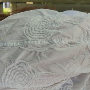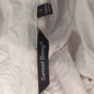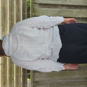 This is a statement piece blouse. It buttons behind a lapel type front that folds back away from the buttons all the way down the front. Embroidery all over in circles/swirls. A jacket style seam across the lower back. Quality Cotton fabric gives this garment the ability to hold its shape. Excellent worn condition. I found one small pale yellow spot that is completely behind the 'lapel' and would not be seen. I have owned this long enough that its almost Vintage.