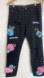 Designer woman's black jeans with vibrant floral embroidery. Features pink and blue flowers with ripped jean features.Perfect for a trendy look.