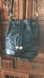 Elegant black faux leather bucket bag with gold accents. Perfect for any occasion.