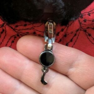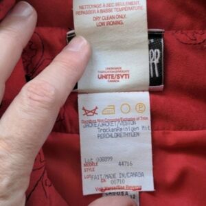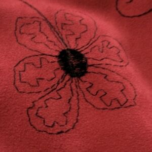 In deep red color with black embroidered flowers and black trim around the collar and sleeves hem.