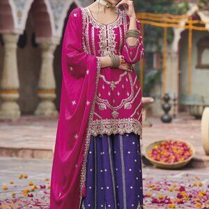 Color Combo: Pink Top | Purple Palazzo | Pink Dupatta Style: Palazzo Style Suit Fabric: Chinon Silk Work: Zari | Thread Embroidery | Sequins Occasion: Wedding, Eid, Party Wear, Festive Gatherings Package Includes: Embroidered Top | Flared Palazzo | Net Dupatta