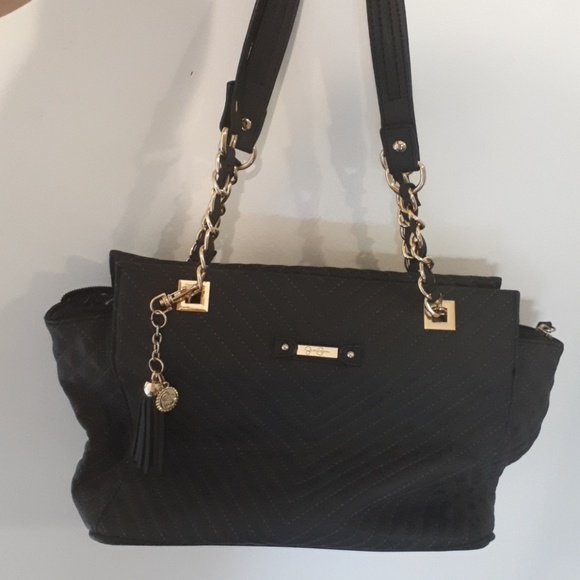 Stylish black purse with one big pocket seperated by a zipper to divide into two sections to keep your purse organized, with an added pocket on the outside of the purse.