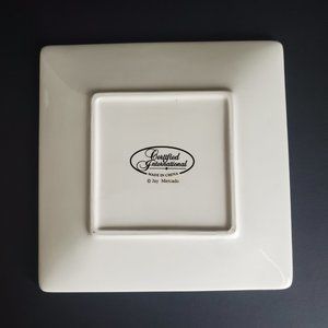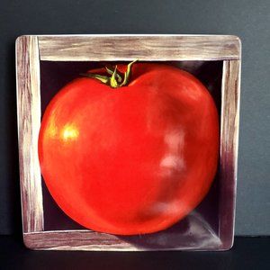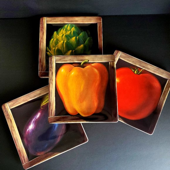 Designer HARRY & DAVID Square Veggie Design Side Plates | Beautifully designed with a painted wood trim design look | Vibrant colours on the veggies: Red Tomatoe, Yellow Bell Pepper, Green Articoke, Purple Eggplant | Each plate size 8" x 8"