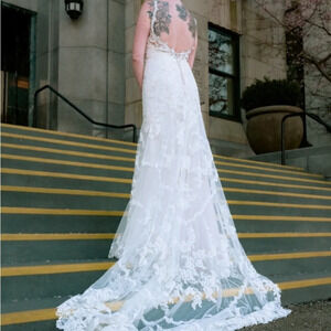 From Stella York website: This romantic lace gown meets all the desires of the modern bride. Featuring a romantic sweetheart neckline, the bodice of this gown is highlighted with elegant lace sleeves and a flirty sheer cutout along the neckline. In a figure-flattering, fit-to-flare silhouette, this lace dress hugs your curves effortlessly before flaring out into a subtle skirt – accented beautifully with a scalloped-lace trim.