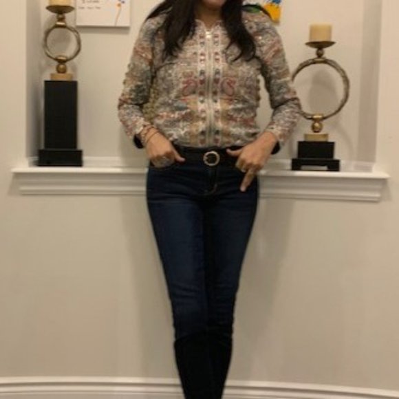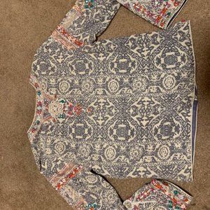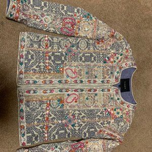 Designer Cotton Zipper with Satin lining inside. Two times wear. Overall Grey Printed with mirror and threadwork with silver thread lining also to make it a complete Party wear upper for girls. The Jacket Size will fit Small & Medium both. The brand name written is Zaimara.