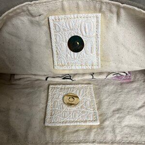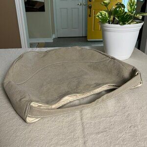 Exterior is soft taupe/beige cotton canvas with white top stitching detail.