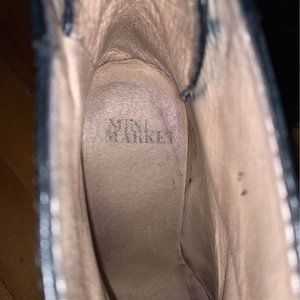 Super soft dark navy leather ankle booties with a leather-covered wedge from Swedish brand Minimarket; lug sole; worn a handful of times - great condition.