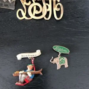 2 brooches, one of skier from Montreux; 1 Carlsberg elephant. Both in good condition for age.
