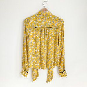 Stunning floral print tie-neck blouse by Designer's Society in sunflower yellow, women's size XS. Worn once, like new condition! This soft and flowy button down features black trimmed piping, a regular fit, a button-down front closure, and a tie-neck collar with long sleeves and forward shoulders seam. Shirred shoulders and back yoke. Pair it with jeans or pants for an elevated, refined look.