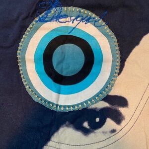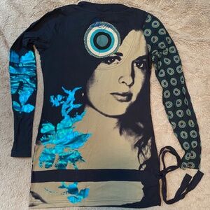 Long sleeve shirt with cool details, shiny leaves, circle patch on back, ties at bottom.