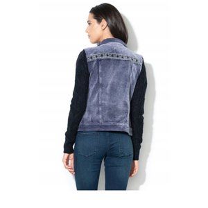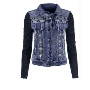 Stylish denim jacket with black sleeves. Button-up front. Unique design by Desigual.