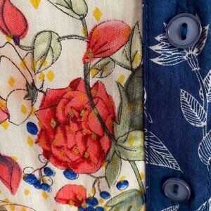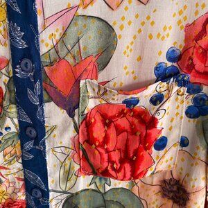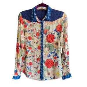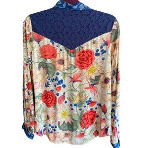 White background, long-sleeved shirt with a floral print and crochet lace detailing.