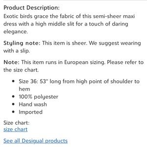 New with tags Desigual “Bulgaria” sheer maxi dress with sequinned bodice, ruched back, and front slit in women’s size two (2).