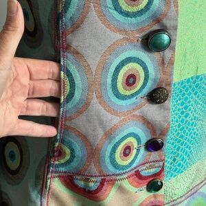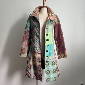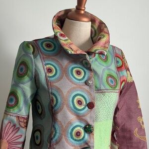 Desigual - Colorful Floral and Geometric Patchwork Coat - Button Closure with different button (one was replace by a leather button) - Lined- 2 pockets - Fitted - Excellent pre-owned condition