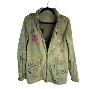 Desigual Embroidered Distressed Green Hooded Jacket Sz M Eclectic Edgy Artsy