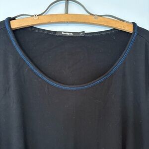 Signature Desigual style with a playful twist — this black knit dress features a floral pleated inset and subtle blue metallic stitching. Easy A-line silhouette that works from casual outings to resort wear.