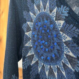 Blue dress with metallic fibers throughout, mandala print with embroidered sequins. Pulllover dress in great condition.