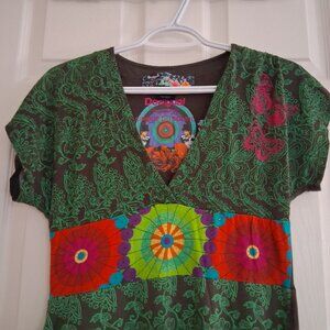 Step right up and add some whimsy to your wardrobe with this Desigual dress! This piece is part of the iconic collection inspired by the vibrant artistry and magic of Cirque du Soleil. It's a true statement dress that blends artistic graphics with a flattering, easy-to-wear silhouette. The dress features a rich deep green base with an all-over intricate print of paisley, butterflies and floral motifs. The centrepiece is a bold, colorful mandala-like floral design with small gem appliques across the chest, echoing the breathtaking costumes and stage presence of the circus. You'll also spot a playful artistic portrait on front and back of dress. This dress has a relaxed, slightly A-line cut with a flattering V neck and short sleeves. Perfect for adding a pop of color to your causal rotation, an artistic outing, or a fun festival look!