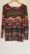 Desigual. Floral striped print on a light sweater. Long raglan sleeves. Metallic woven throughout (not scratchy!). Rounded neckline. 89% viscose, 7% polyamide, 4% metallic. Excellent condition.