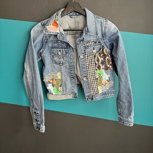 Stylish jean jacket with vibrant patchwork. Features button closure and chest pockets. Unique design by Desigual.