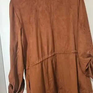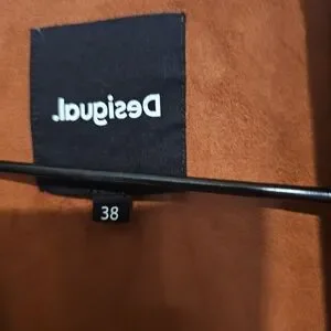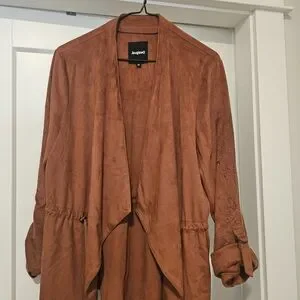 Elegant Desigual jacket in rust. Features open-front design and rolled sleeves. Embroidery on sleeves. Soft material. Hangs beautifully.