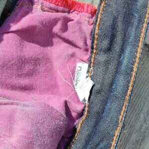 The zipper works, the button is intact and the rainbow floral detailing is in nice condition. There is a small fraying spot under the back belt loop that is hard to notice. Please see photo 9. Large jewel button is intact.