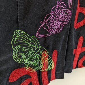 This gorgeous rich coloured Desigual Jacket has its iconic collage mix of different prints and words and this one is a masterpiece! The inner lining is also really neat with its iconic male female figures. Back has embroidered butterflies, lips, dragonfly, and word motif. If buttoned all the way up, it's a high collar.