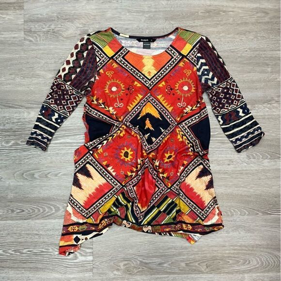 Desigual Womens Tunic Top Red Black Aztec 3/4 Sleeve Scoop Neck Blouse M