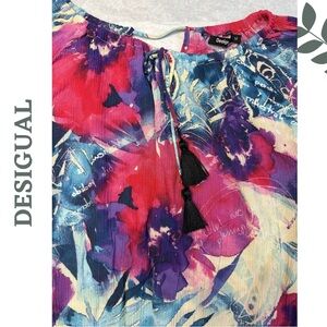 Desigual Zazil Blouse Pink Blue Oversize Floral Top Balloon Sleeve Tassel Medium