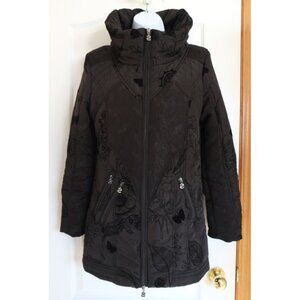 I wore this as a spring/fall/early winter coat, usually with a 2-ply cashmere sweater underneath. It's a Spanish size 36, which, according to Desigual, is a US XS, but it's more like a US Small unless you want to wear bulky clothing underneath. In all cases, check the measurements below: