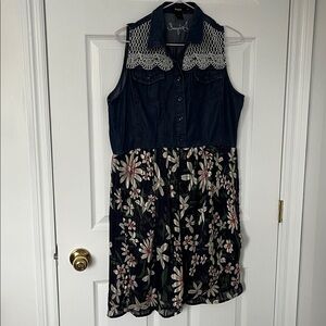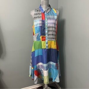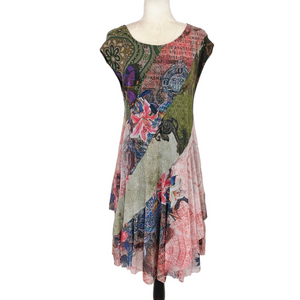 A gorgeous, shape flattering stretchy dress by Desigual. You can dress up and down and it will alwayss shine. Faux wrap style, with some ruffle around waist to cover those unwanted creases while enhancing your lovely figure.