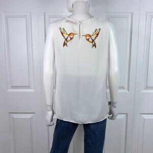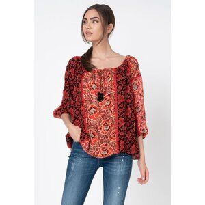 Absolutely gorgeous blouse, sheer fabric but no need for undershirt, elastic wiast so the bottom can be put inside or left outside for added belt touch. It has never been never worn, I took off the tags when crossing the borders in EU. Purchased in EU.